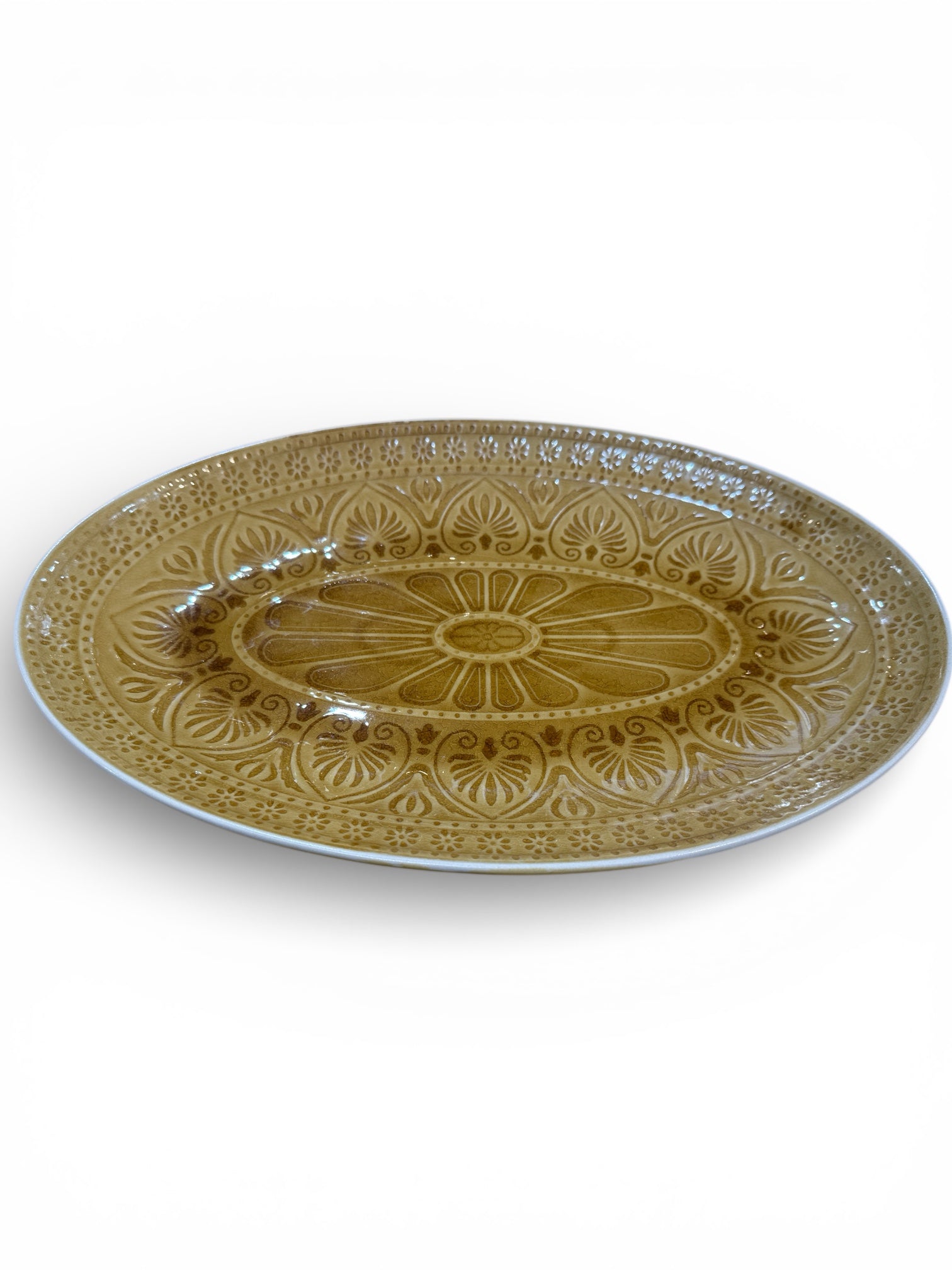 Yellow stoneware oval serving platter.