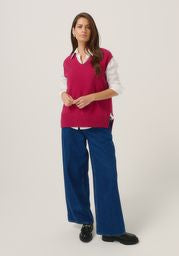 The Andi Possum Merino Vest is a versatile knit piece designed for comfort and style. Its relaxed fit and flattering V neckline with rib detailing add a subtle elegance to your outfit. Ideal for transitional weather, it layers beautifully over a shirt or stands out on its own with bare arms. Soft merino wool combined with possum fibers ensures warmth without bulk, making this vest a perfect addition for adapting to changing temperatures. Thoughtful details like side splits and a dropped back hem let you choose how to wear it—tucked in for a polished look or worn out for a casual statement.