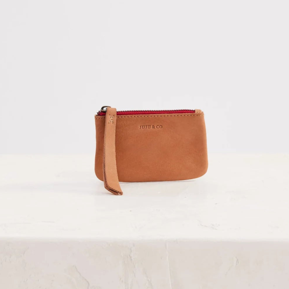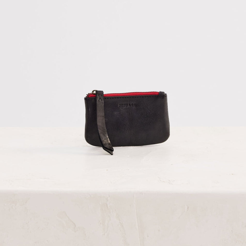 Small sized unlined pouch, with a contrast red zip & an internal split key attached. Available in three signature colours.