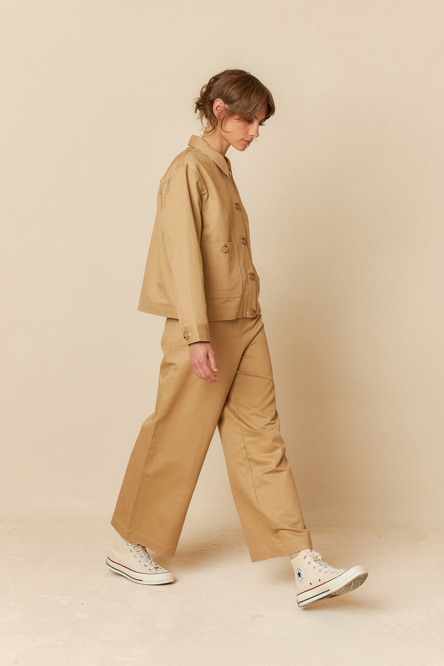 This pant has a high waist with zipper and button closure and twill fabric with contrast stitching.
