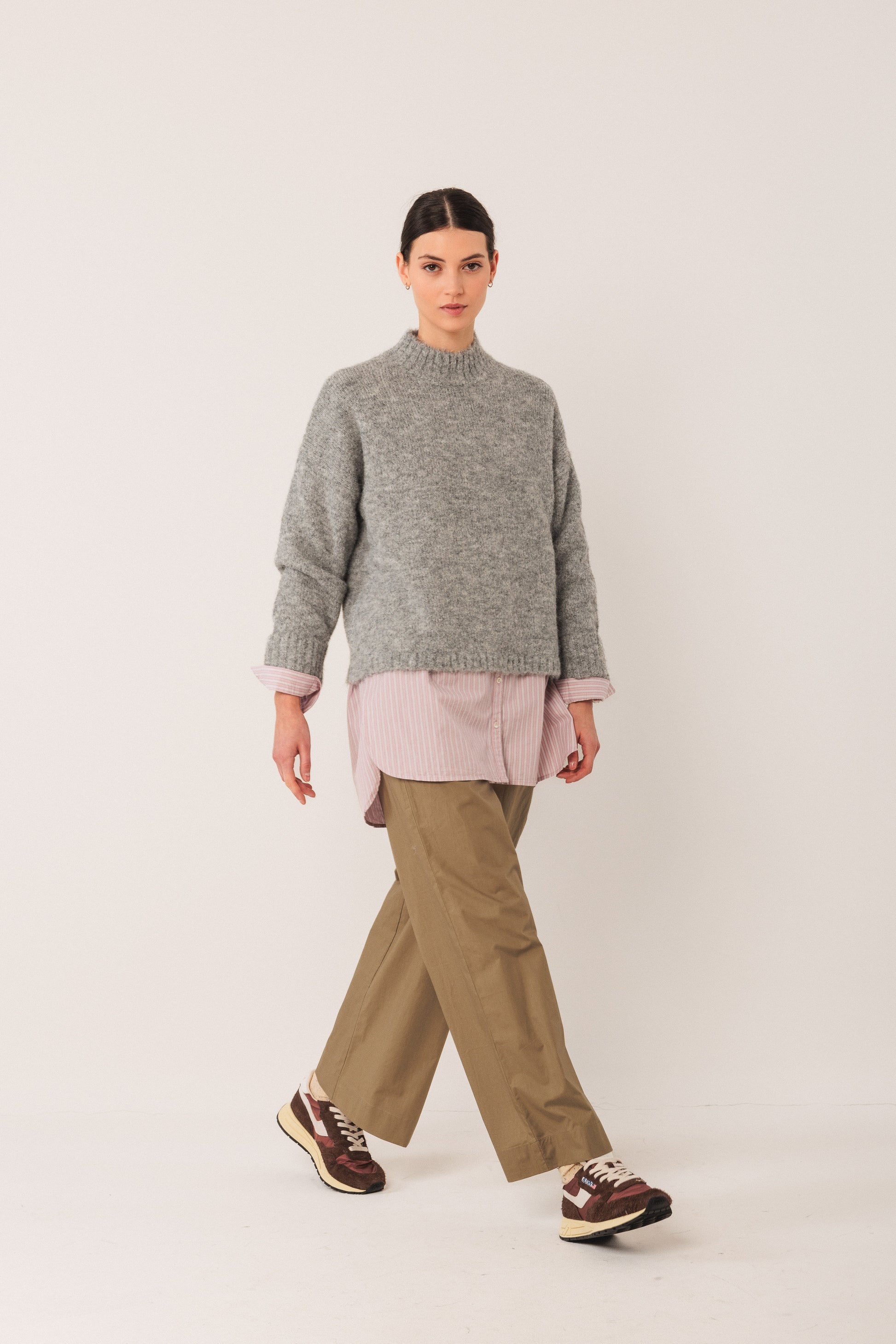 Dropped shoulder and long sleeves with cuff and button • Shirt collar and button-front closure plus side slits • Curved hem and slightly shortened front • Striped poplin cotton fabric •