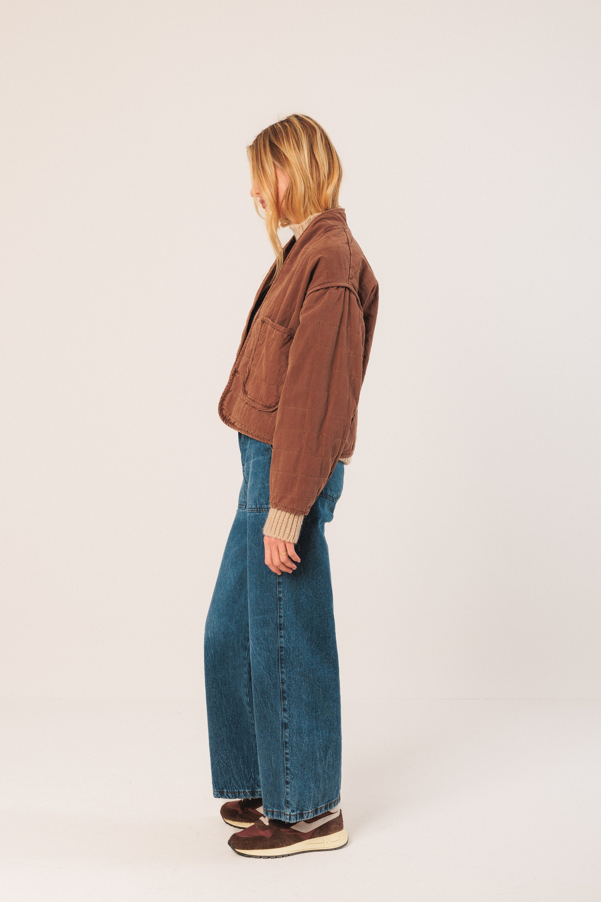 Stand-up kimono collar and dropped shoulder • Maxi front patch pockets • Quilted plaid fabric in cotton twill •